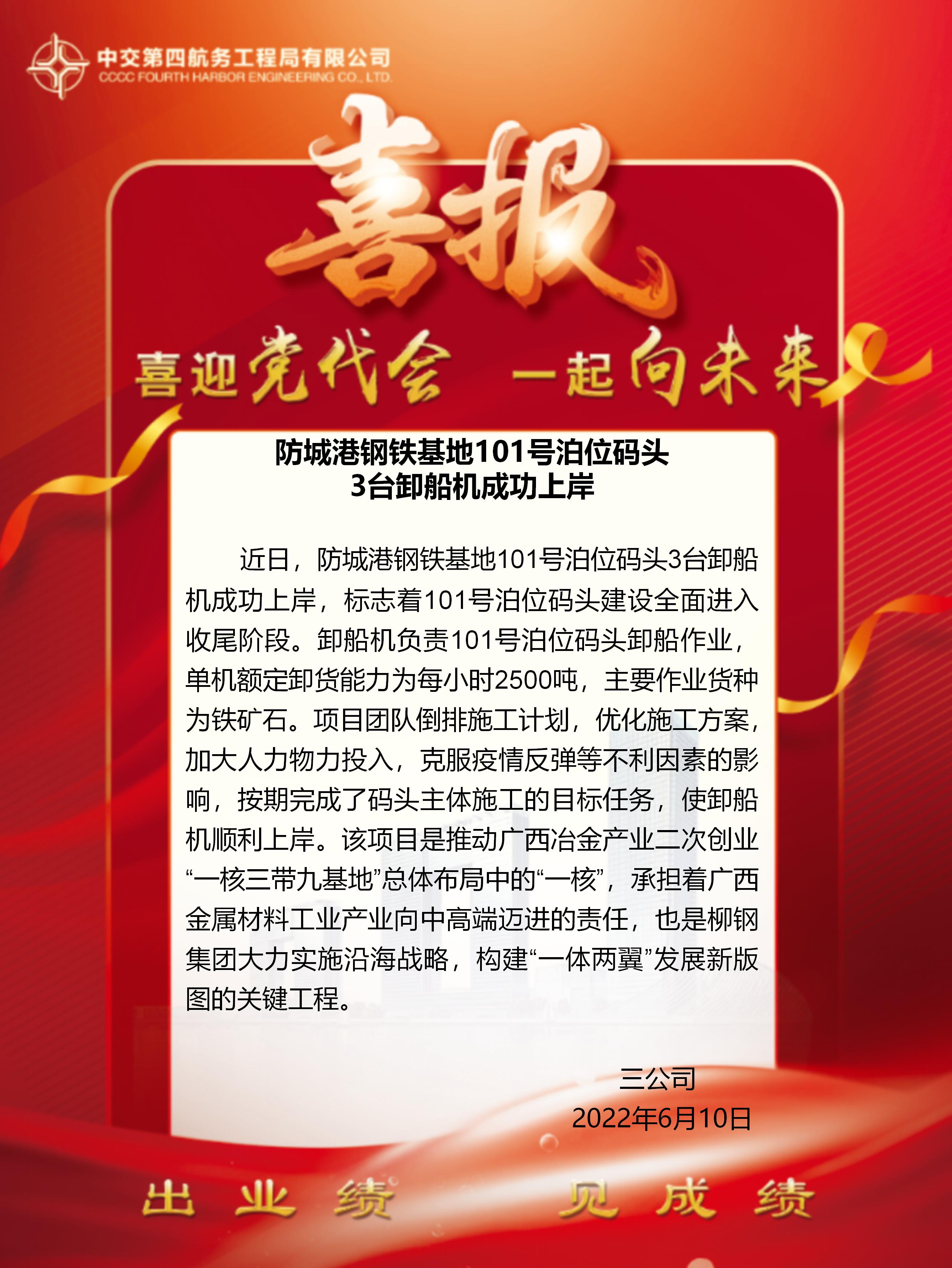 防城港鋼鐵基地101號泊位碼頭3臺卸船機成功上岸