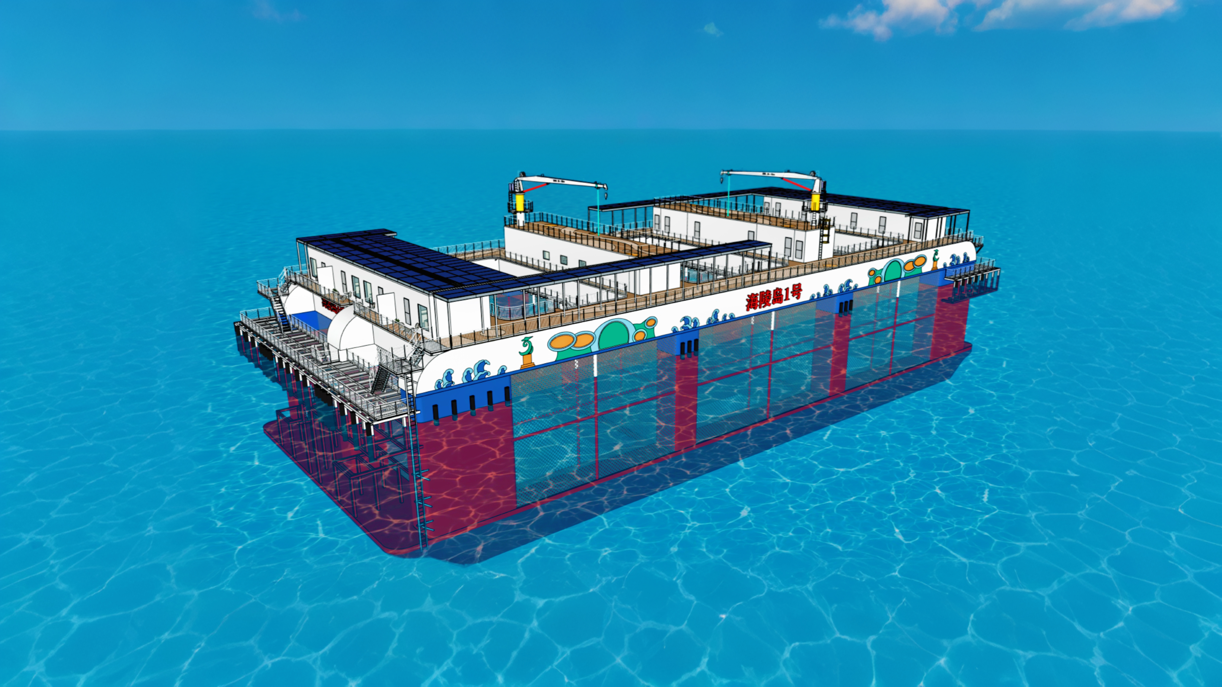 “海陵島一號”生態(tài)化海洋牧場創(chuàng)新園是大型半潛式桁架養(yǎng)殖平臺,全長82米,型寬36米,型深15米,平臺高度21.5米,總養(yǎng)殖水體達4.4萬立方米,入級中國船級社。該平臺集成了智能投喂、環(huán)境監(jiān)測、病害預警等先進系統(tǒng),可實現(xiàn)漁業(yè)養(yǎng)殖集約化、智能化、綠色化發(fā)展。