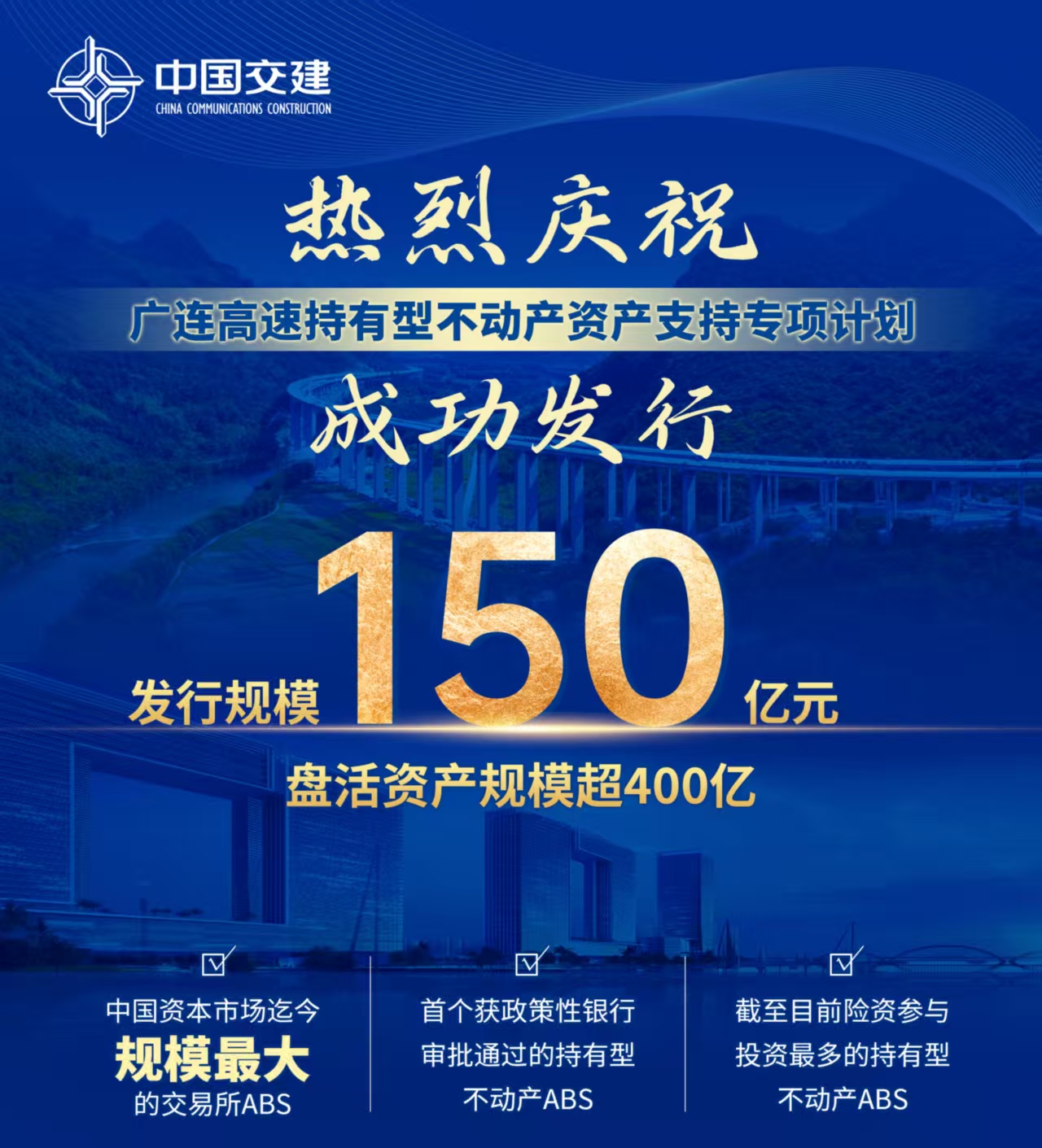近日,廣連高速持有型不動(dòng)產(chǎn)資產(chǎn)支持專項(xiàng)計(jì)劃在上海證券交易所成功發(fā)行。廣連高速不動(dòng)產(chǎn)ABS項(xiàng)目發(fā)行規(guī)模達(dá)150億元,盤(pán)活資產(chǎn)規(guī)模估值超400億。本交易創(chuàng)下多項(xiàng)市場(chǎng)記錄:規(guī)模最大的存量基礎(chǔ)設(shè)施資產(chǎn)盤(pán)活交易、發(fā)行規(guī)模最大的企業(yè)ABS的持有型不動(dòng)產(chǎn)ABS。同時(shí),也創(chuàng)下企業(yè)成本最低的持有型不動(dòng)產(chǎn)ABS、首單獲政策性銀行審批通過(guò)的持有型不動(dòng)產(chǎn)ABS 等記錄,也是四航局通過(guò)金融創(chuàng)新盤(pán)活存量資產(chǎn)的最新成果。
